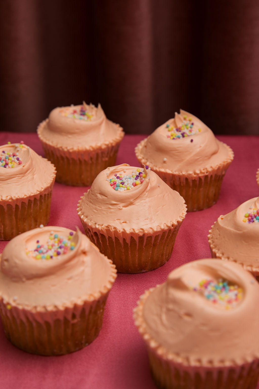 Vanilla cupcakes filled with french vanilla buttercream and iced with swiss meringue buttercream in the colour of your choice and finished with sprinkles, also your choice!